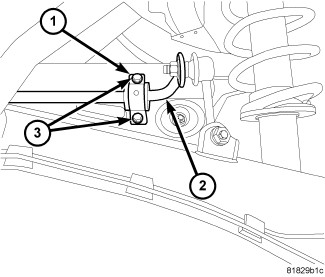 4. On each side of the vehicle, install the stabilizer link upper stud in the end of the stabilizer bar (3). Install the nut (1) on each upper stud and while holding the stabilizer link stud stationary, tighten the nut (2) to 50 Nm (37 ft. lbs.).