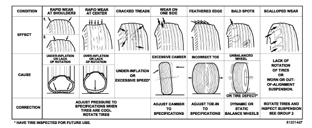 Excessive camber causes the tire to run at an angle to the road. One side of tread is then worn more than the other.