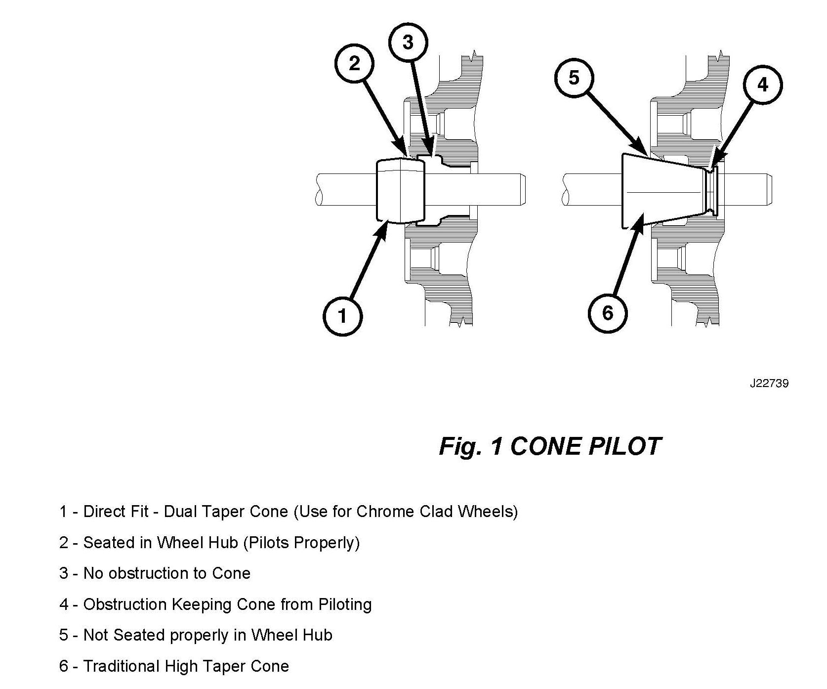 Models equipped with Chrome Clad wheels require specific piloting on balance equipment to properly center the wheel and prevent damage to the chrome clad surface. The chrome cladding is not removable or replaceable and has cladding tabs that extend into the wheel bore. Traditional high-taper cones will come into contact with the cladding tabs rather than properly seat on the hub bore chamfer. Many modern aluminum wheel designs cannot be mounted with traditional cones. Direct-Fit Collets should be used to properly mount clad wheels on balance equipment (Fig 1).
