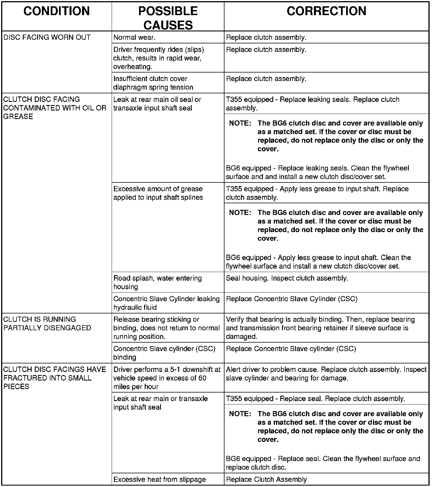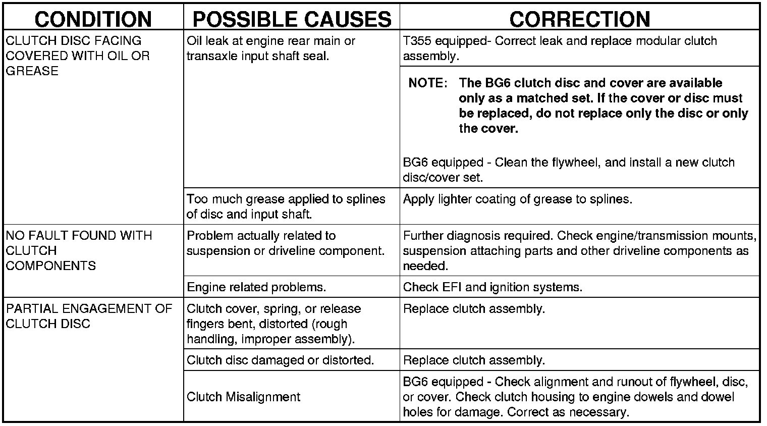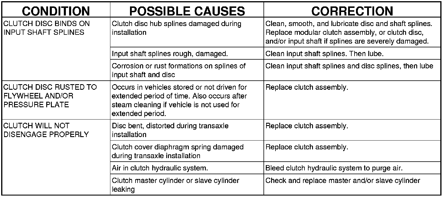 Drive the vehicle at normal speeds during road test. Shift the transaxle through all gear ranges and observe clutch action. If chatter, grab, slip, or improper release is experienced, remove and inspect the clutch components. If the problem is noise or hard shifting, further diagnosis may be needed. The transaxle or other driveline components may actually be at fault.
