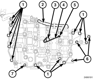15. Remove the mounting bolts (1) and (7) of the control valve body assembly.