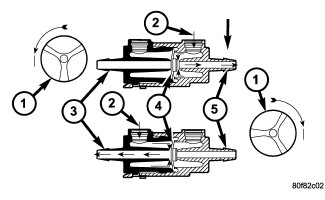 When the pump impeller (1) rotates in the counterclockwise direction (viewed from the bottom), the biased diaphragm is sealing off the rear washer system outlet and nipple so the pressurized washer fluid is pushed out through the pump front outlet port and the front washer outlet nipple (5). When the pump impeller rotates in the clockwise direction (viewed from the bottom), pressurized washer fluid is pushed out through the pump rear outlet port and moves the diaphragm to open the rear washer outlet nipple and seal off the front washer outlet nipple, then the pressurized washer fluid is pushed out through the rear washer outlet nipple (3).