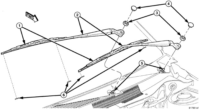 1. The front wiper arms (2) must be indexed to the pivot shafts (5) with the front wiper motor in the park position to be properly installed. Position the wiper arm pivot end onto the wiper pivot shaft so that the wiper blade (1) is aligned with the wiper alignment lines (6), which are horizontal marks concealed in the upper margin of the lower windshield blackout area.