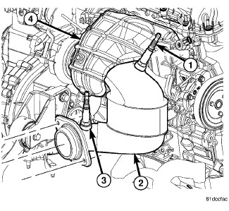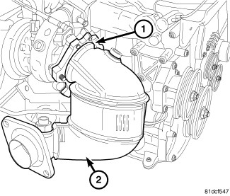 1. Position the catalytic converter on the turbocharger. Loosely in stall the catalytic converter bracket bolts and the catalytic converter-to-turbocharger bolts.