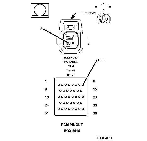 1. Using the wiring diagram/schematic as a guide, inspect the wiring and connectors between the VCT solenoid and the Powertrain Control Module (PCM).