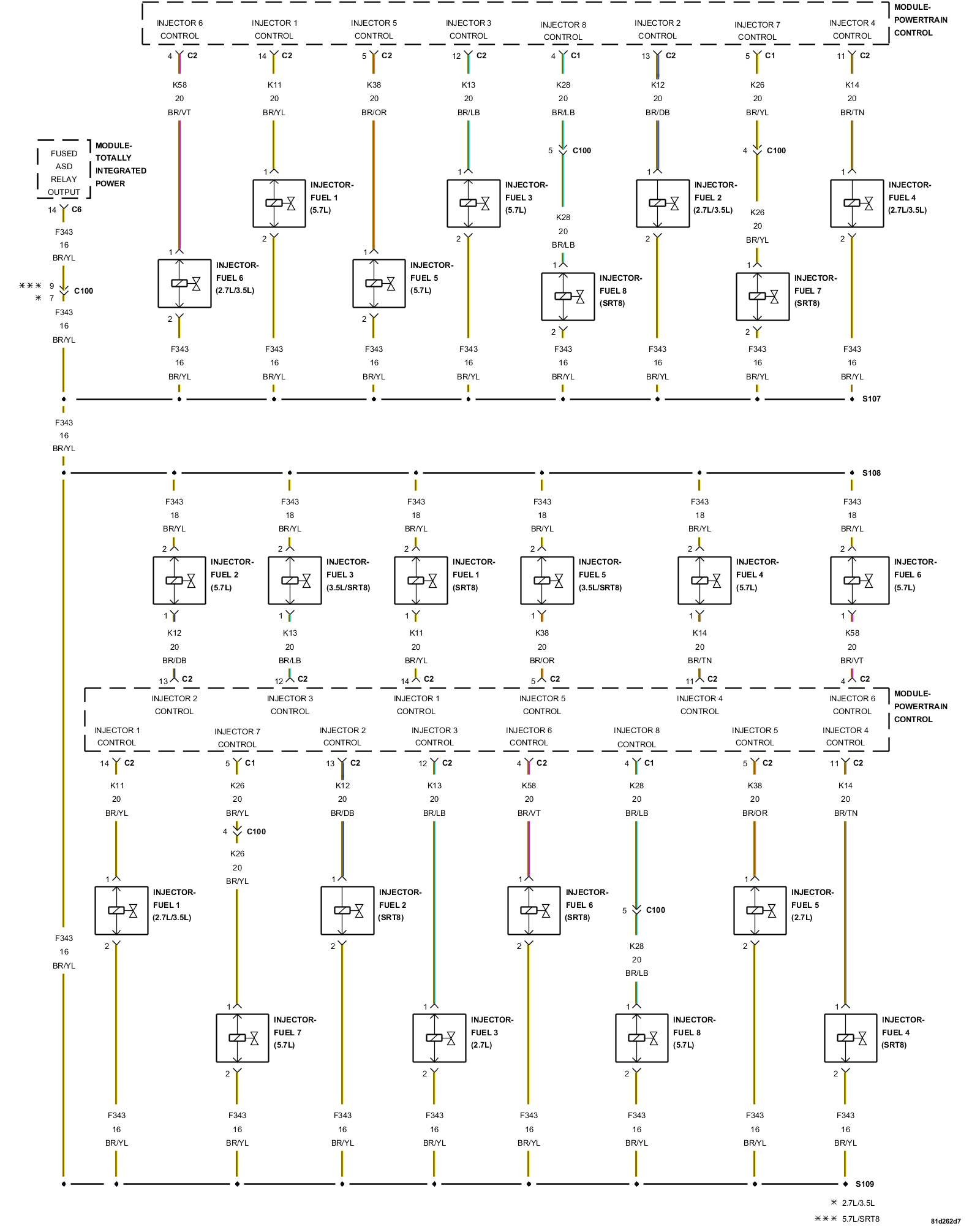 6. Using a 12 volt test light connected to ground, check the (K343) Fused ASD Relay Output circuit in the Fuel Injector 2 harness connector.