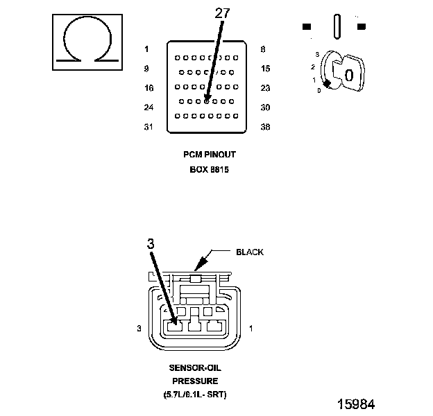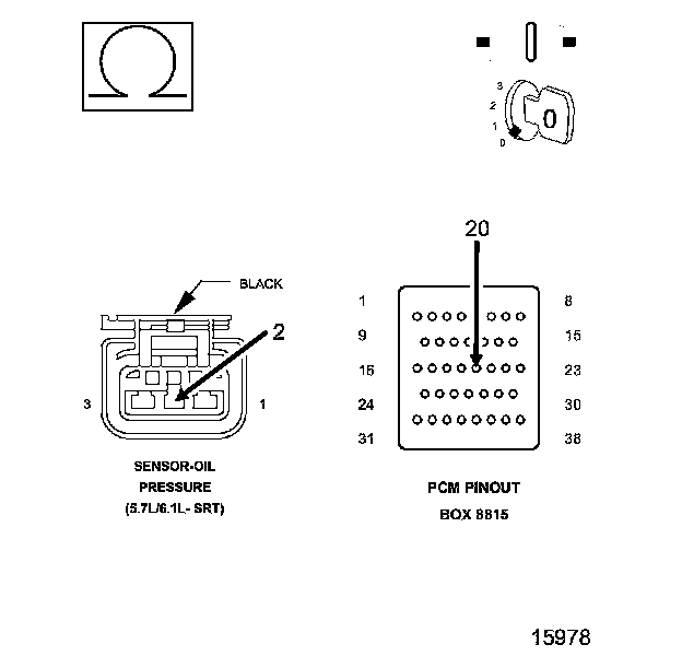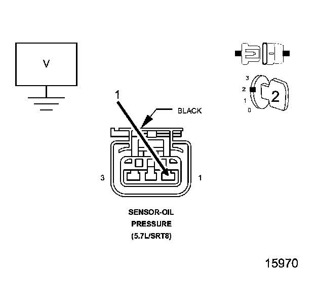 1. Using the wiring diagram/schematic as a guide, inspect the wiring and connectors between the Engine Oil Pressure Sensor and the Powertrain Control Module (PCM).