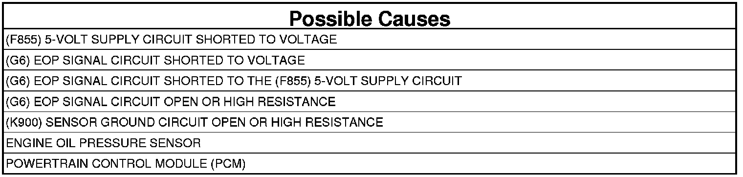The PCM detects that the Engine Oil Pressure Sensor input voltage is above the maximum acceptable value. One trip fault.