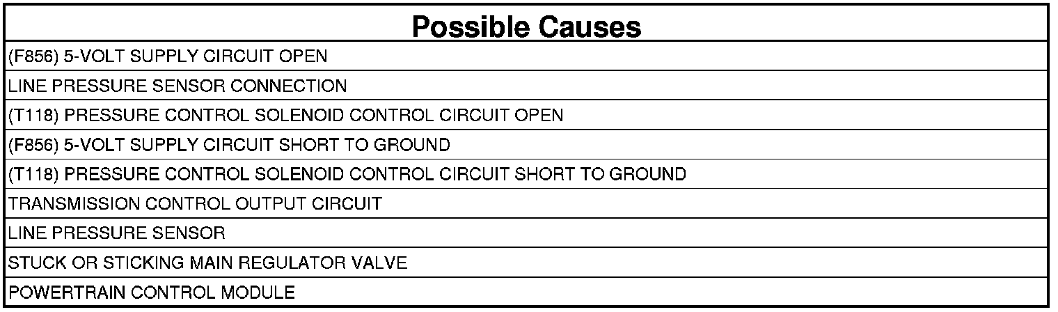 The PCM continuously monitors Actual Line Pressure. If the Actual Line Pressure reading is greater than the highest Desired Line Pressure ever used in the current gear, while the Pressure Control Solenoid duty cycle is at or near its maximum value (which should result in minimum line pressure), the DTC will set.