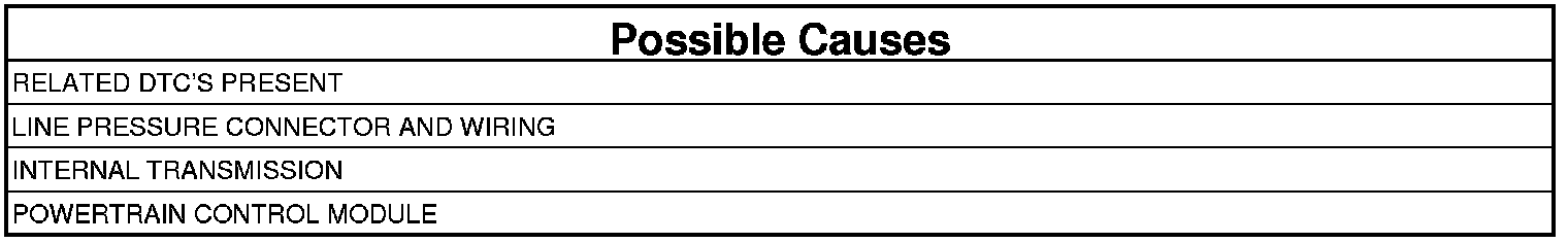 - Repair internal transmission and inspect the oil pump and replace if necessary. If no problems are found, replace the Line Pressure Sensor/Variable Force Solenoid Assembly - possible cause is the Pressure Control Solenoid is stuck.