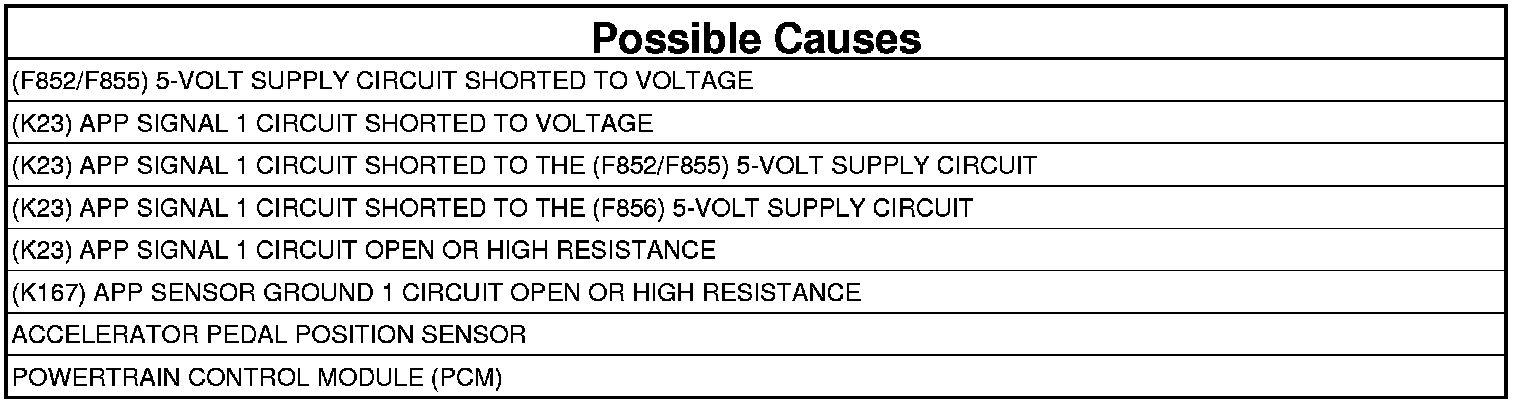 - Repair the (K23) APP Signal 1 circuit for a short to the (F852/F855) 5-volt Supply circuit.
