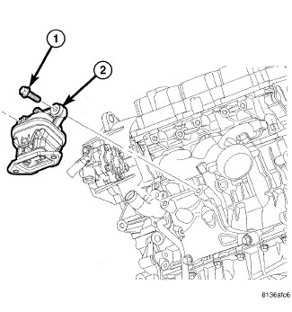9. Remove the bolts (1) and the left engine mount (2).