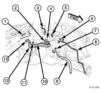 27. Connect the front section of the A/C suction line (9) to the rear section of the A/C suction line (12) with a new dual plane seal. Install the nut (7) and tighten to 22 Nm (16 ft. lbs.).