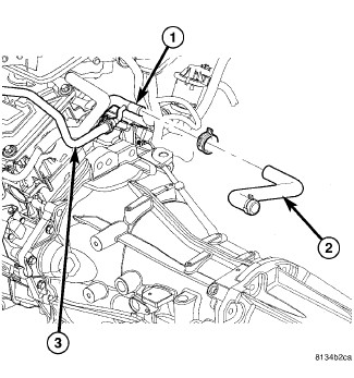 25. Connect the heater hose (2) and coolant reservoir hose (3) to the rear coolant pipe (1).