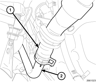 24. Connect the heater hose (1) to the extension pipe (2).