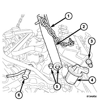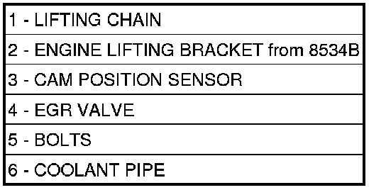 1. Connect the engine lifting bracket (2) from the Engine Support Fixture 8534B to the right rear of the cylinder head outer most bolt access hole. Tighten the bolt (5) to 21 Nm (15 ft. lbs.).