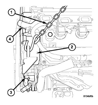 3. Connect an engine hoisting chain (1) to the engine lifting point on the left side of the rear timing cover (2) and the previously installed 8534B engine lifting bracket.
