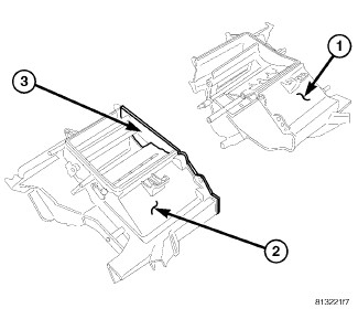 7. Position the front floor distribution duct (2) onto the air distribution housing (3).