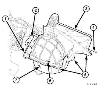 1. Position the air inlet housing (6) onto the HVAC housing (7).