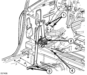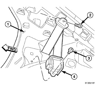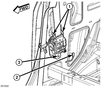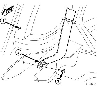 2. Install the front seat belt retractor retaining bolt (3). Tighten bolt to 32 Nm (24 ft. lbs.).
