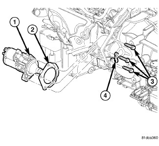 3. Install starter mounting bolts (3), and electrical harness mounting bracket (4). Tighten bolts to 54 Nm (40 ft. lbs.).