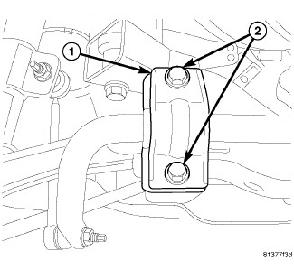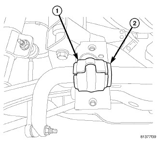 15. Install bolts (2) securing stabilizer bar bushing retainer halves (1) to cradle. Tighten bolts to 60 Nm (44 ft. lbs.).