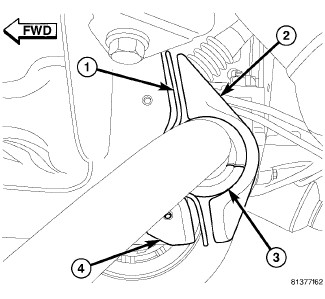 13. Utilizing slit in bushing, install stabilizer bar bushing (1) against locating collar on stabilizer bar (2) as shown. Make sure slit in bushing is positioned toward rear of vehicle.