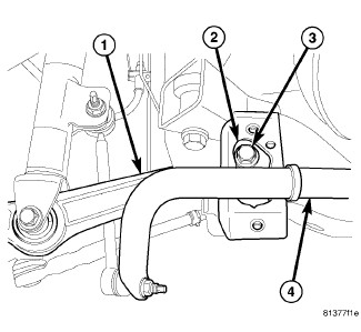 1. Slide lower control arm (4) into position in engine cradle and install mounting bolt from rear.