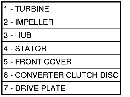 The torque converter is a hydraulic device that couples the engine crankshaft to the transmission. The torque converter consists of an outer shell with an internal turbine (1), a stator (4), an overrunning clutch, an impeller (2) and an electronically applied converter clutch (6). The converter clutch provides reduced engine speed and greater fuel economy when engaged. Clutch engagement also provides reduced transmission fluid temperatures. The torque converter hub drives the transmission oil (fluid) pump.