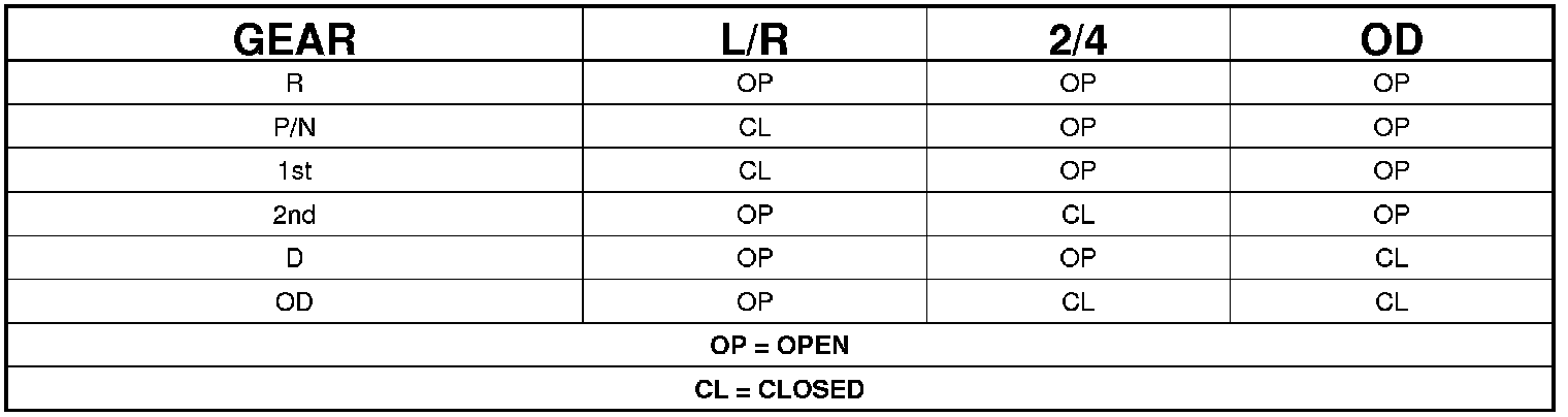 The TCM relies on three pressure switches to monitor fluid pressure in the L/R, 2/4, and OD hydraulic circuits. The primary purpose of these switches is to help the TCM detect when clutch circuit hydraulic failures occur. The range for the pressure switch closing and opening points is 11-23 psi. Typically the switch opening point will be approximately one psi lower than the closing point. For example, a switch may close at 18 psi and open at 17 psi. The switches are continuously monitored by the TCM for the correct states (open or closed) in each gear as shown in the following chart: