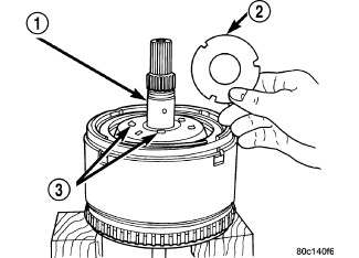 NOTE: The number seven needle bearing has three anti-reversal tabs and is common with the number five and number two position. The orientation should allow the bearing to seat flat against the rear sun gear. A small amount of petrolatum can be used to hold the bearing to the rear sun gear.