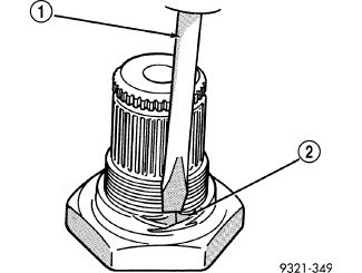 CAUTION: Failure to grind and open stakes (4) of the output shaft nut will result in thread damage to the shaft during nut removal.