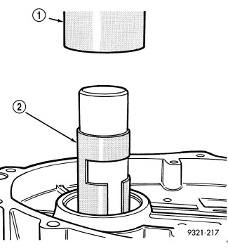 60. Use Wrench 6597 (2) and handle C-4171 (1) and C-4171-2 to press the rear output shaft bearing cup rearward.