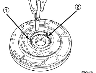 2. Measure the clearance between the outer gear (1) and the pump pocket (2). Clearance should be 0.089-0.202 mm (0.0035-0.0079 in.).