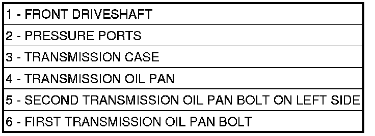 NOTE: Before installing the oil pan bolt in the bolt hole (5) located between the torque converter clutch on and U/D clutch pressure tap circuits, it will be necessary to replenish the sealing patch on the bolt using MOPAR(R) Lock & Seal Adhesive.