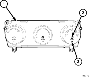 The electric backlight (EBL) system is controlled by a momentary switch (2) located in the A/C-heater control (1) on the instrument panel. When the rear window defogger switch is pressed to ON, the A/C-heater control energizes the rear window defogger (EBL) relay and fused battery current is then directed through the relay and to the rear window defogger grid lines and to the heated outside rear view mirrors, when equipped. The grid lines heat the glass to help clear the rear window and outside mirror surfaces of fog or frost.