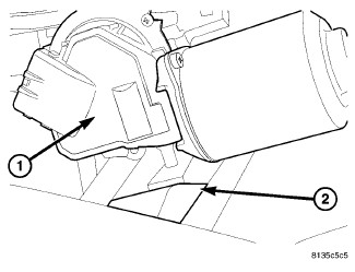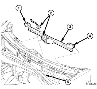 2. While positioning the wiper module in its mounting location, make sure that the dowel on the bottom of the wiper motor (1) slides into the mounting grommet (2) correctly.