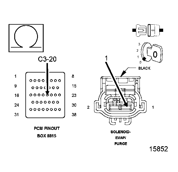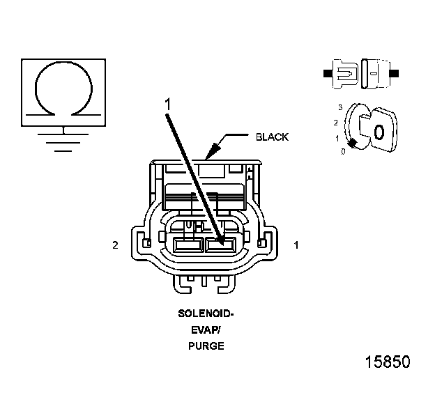 1. Using the wiring diagram/schematic as a guide, inspect the wiring and connectors between the Evap Purge Solenoid and the PCM.
