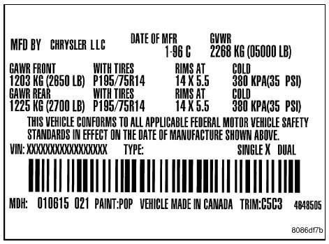 A vehicle certification label is attached to every Chrysler LLC vehicle. The label certifies that the vehicle conforms to all applicable Federal Motor Vehicle Standards. The label also lists: