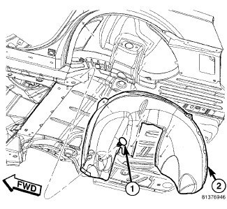 1. Position the rear splash shield (2) into the rear wheelhouse.