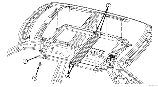 2. Raise sunroof module assembly (1) and guide it carefully into position.