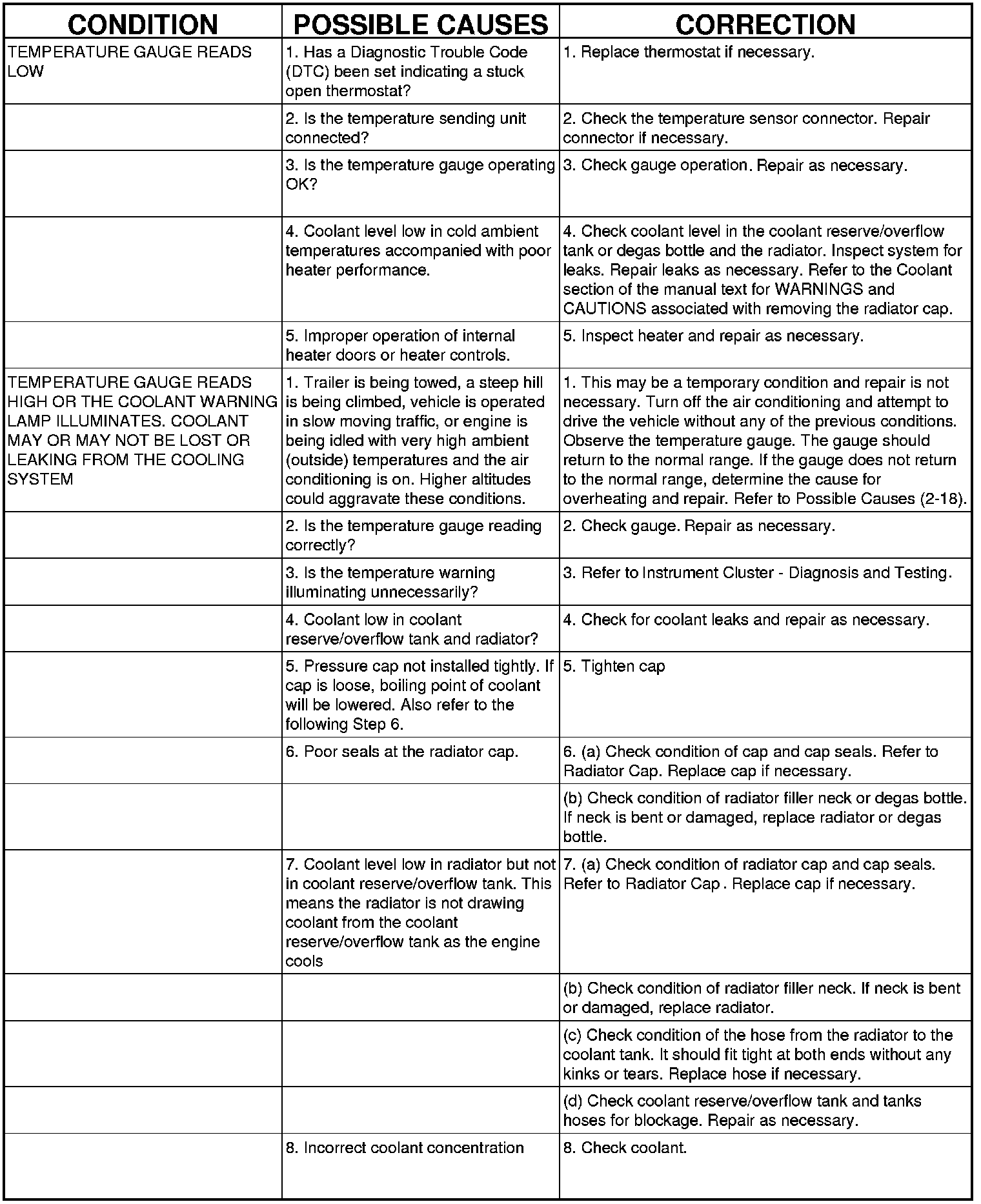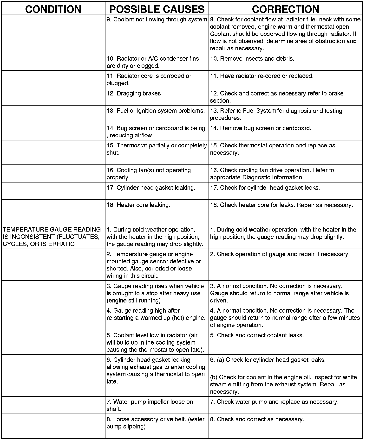 NOTE: If investigation reveals none of the previous items as a cause for an engine overheating complaint, refer to COOLING SYSTEM DIAGNOSIS CHART BELOW.