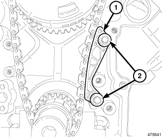 6. If removed, install the timing chain guide (1) and tighten the bolts (2) to 11 Nm (8 ft. lbs.).