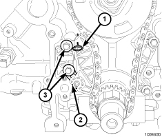7. If removed, install the timing chain tensioner (2) and tighten the bolts (3) to 11 Nm (8 ft. lbs.).