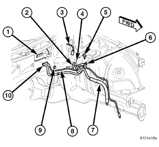 9. Install the bolt (5) that secures the refrigerant line mounting bracket (6) to the left front shock tower (4). Tighten the bolt to 11 Nm (97 in. lbs.).