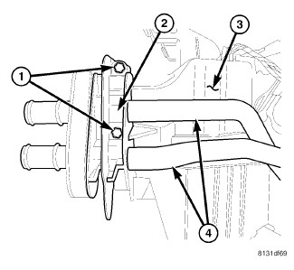 15. Install the heater core tubes (4) and the flange (2) to the front of the HVAC housing (3).