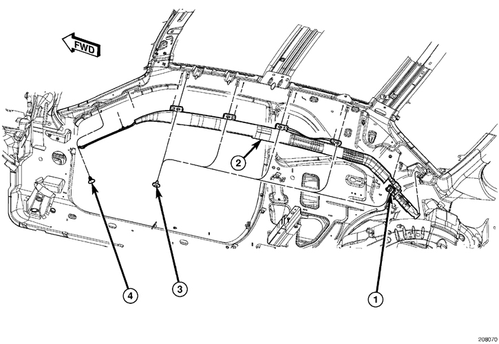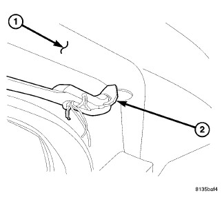 1. Position the curtain airbag (2) in vehicle along the roof side rail and secure with pushpins (4).