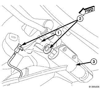 2. Install the bolt (2) securing the inflator to the C/D-pillar. Tighten bolt to 11 Nm (8 ft. lbs.).