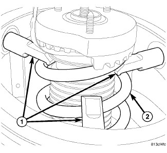 1. Position shock assembly coil spring (1) on hooks (2) of Compressor following manufacturers instructions. Install clamp securing shock to lower spring coil.