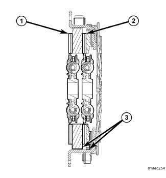 The clutch is a dual disc design. One disc (1) is independent of the pressure plate, located between the pressure plate and flywheel. The second disc (2) is an internal component located between the pressure plates (3) and can not be serviced separately.